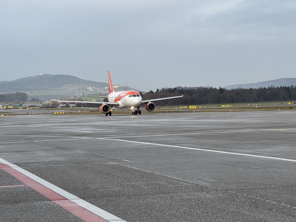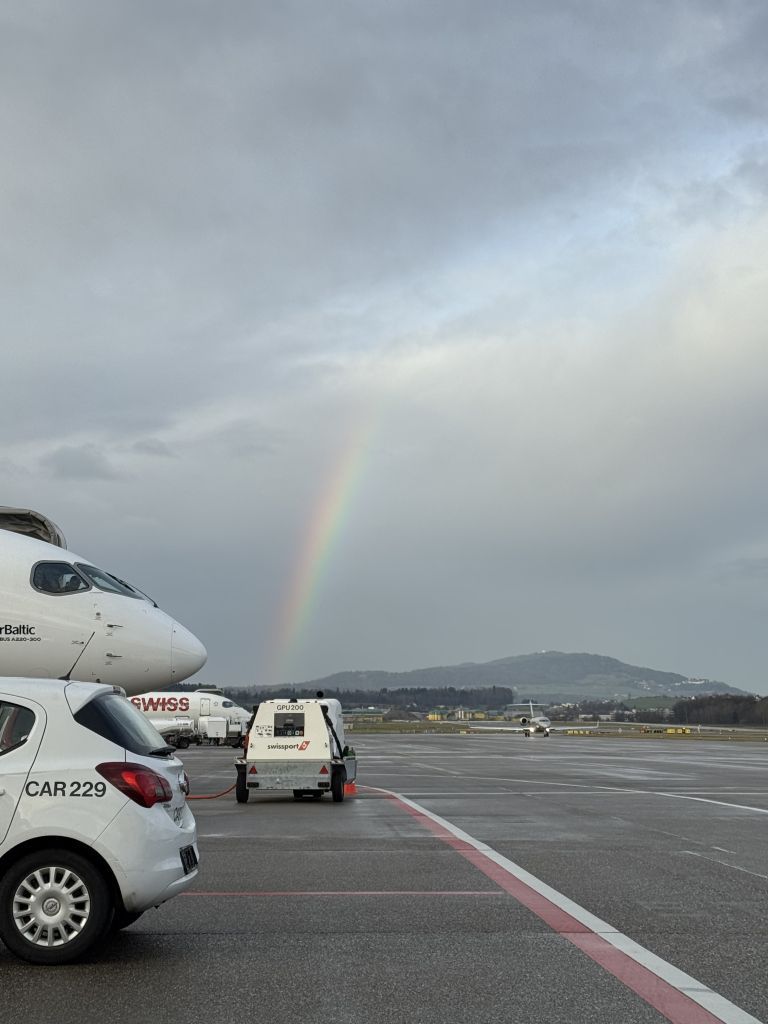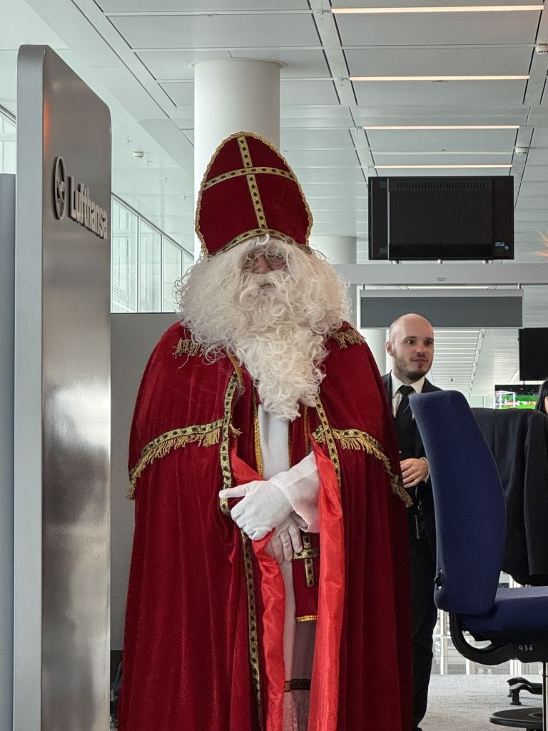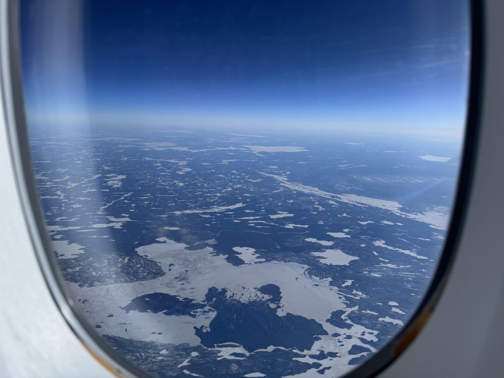 ‘I have a few photos to share. As we were getting ready to board in Munich, Father Christmas showed up. There were several kids on the flight and they were thrilled. I also have a couple photos taken when we were on the tarmac, a rainbow and a plane taxiing for takeoff very near us. I took one window shot of Switzerland and another over Northern Canada. It’s the one with snow.