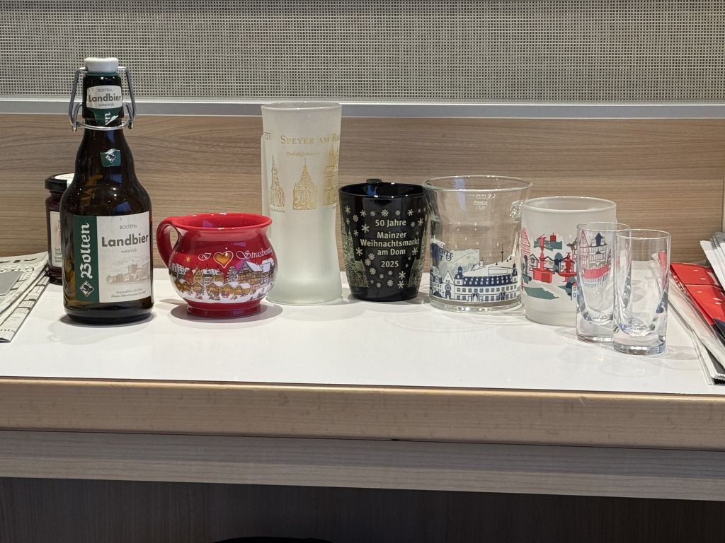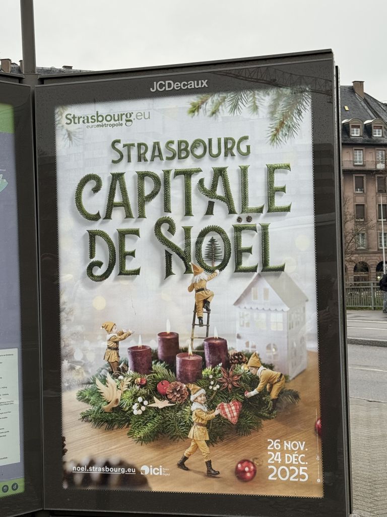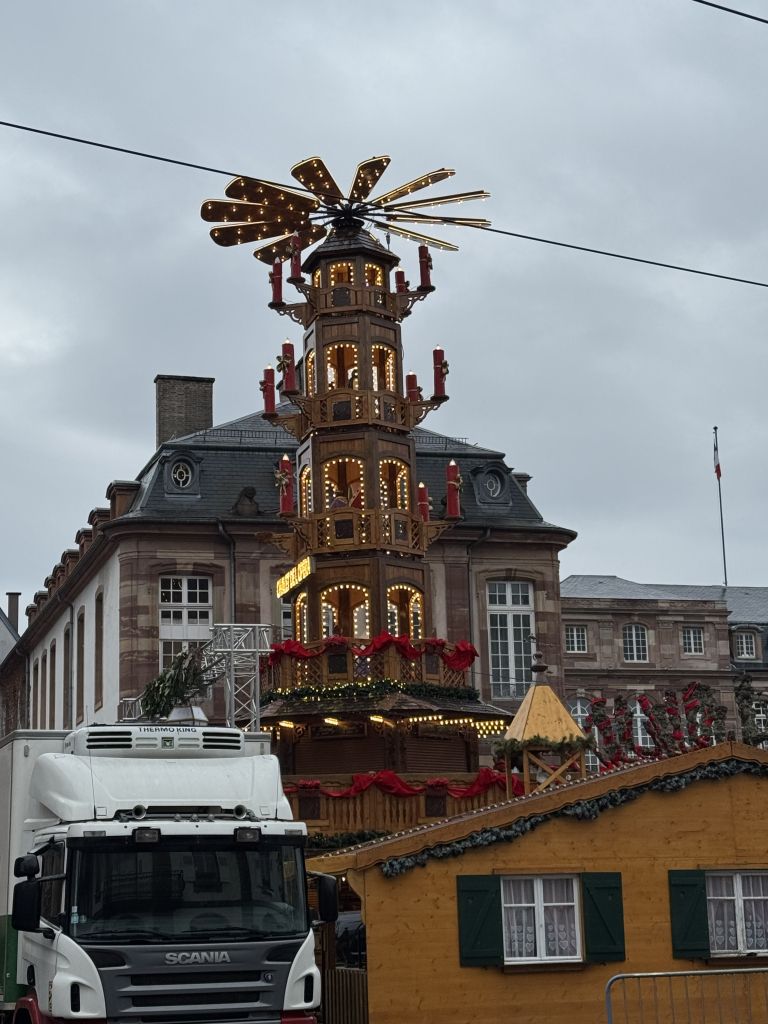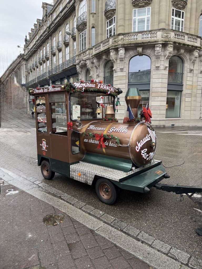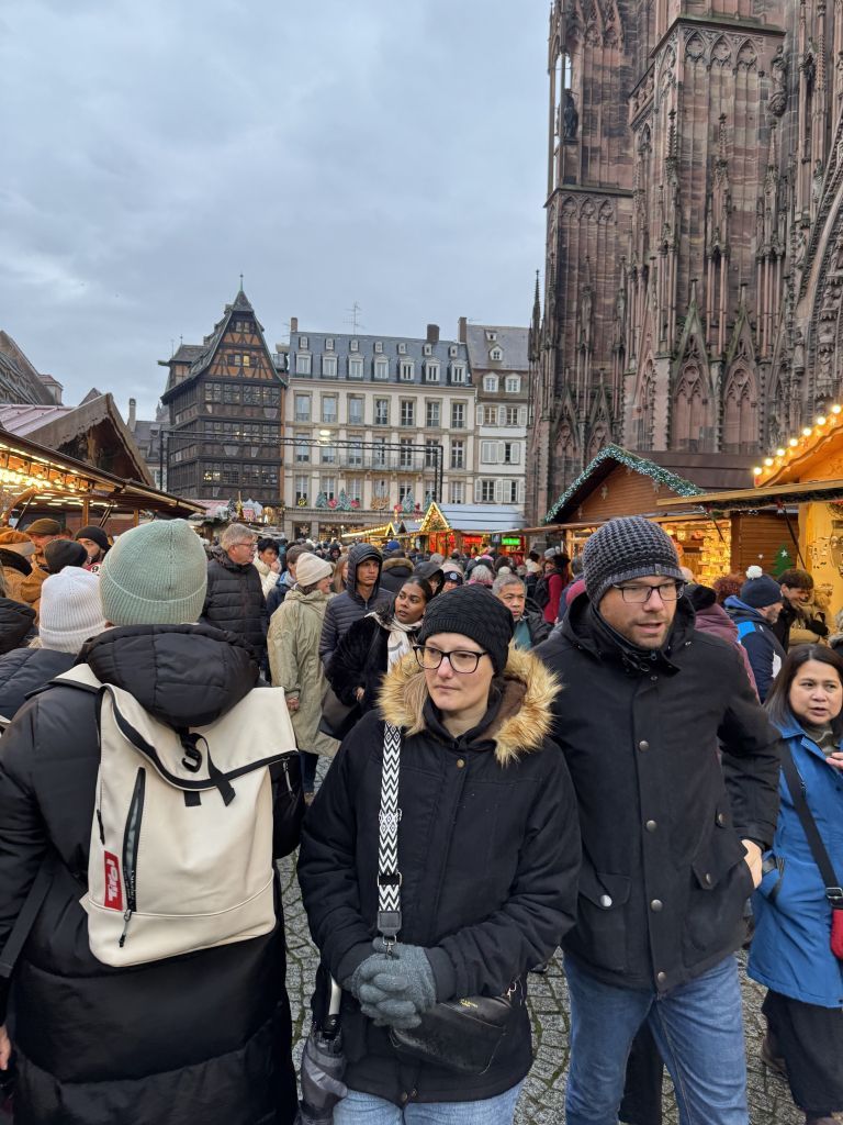 Photos. The top photo is of a tram in the city. Others are of the cathedral, decorations on the market booths, and one shot of the mob in the street. I took a picture of the lady who was making my crepe. It was delicious. There is a picture of my collection of mugs, the pyramid at the entrance to the market and a little cart selling roasted chestnuts. Strasbourg has the oldest Christmas market in Europe. There is also a picture of us entering a lock on the river. We’ve gone through several and gone up 20 or more feet each time.
