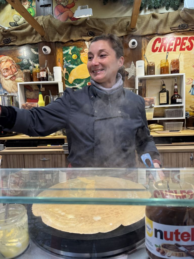 ‘When we came out the market was open. All I wanted was a wine mug. I went to one place and asked, in French, for an empty cup. All they had was plastic. He wouldn’t sell it to me, so we walked on. Then we came to a crepe stand that had a pretty red ceramic mug. I got a sugar and butter crepe and my mug. Betty got a mug too. After she tasted my crepe, she wanted one but we had to go find our meeting point. First we asked a Viking guide where to meet. He pointed us to a square a block away. There we found another guide who pointed us in the right direction. The buses weren’t allowed into the city center. The entire area around the cathedral was blocked off to traffic with police manning the barricades.