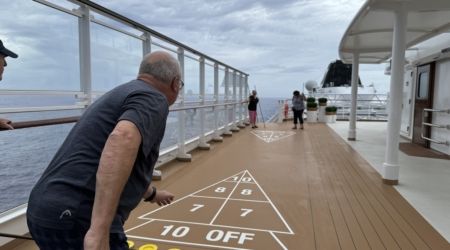 we had a busy schedule today. First was a hearty breakfast at 9:00. Then on to Baggo at 10:00. Baggo is the Australian name for corn hole. Bunny elected to just watch, but I took my turn for the blue team. First we had to throw to the diagonal board. So if I was on the left, I’d be throwing to score on the right board. We got points for being on the board as well as making it into the hole. Second round we had to go halfway yup the main staircase to throw but we could throw straight this team. Sad to say the blue team lost but not by much..
