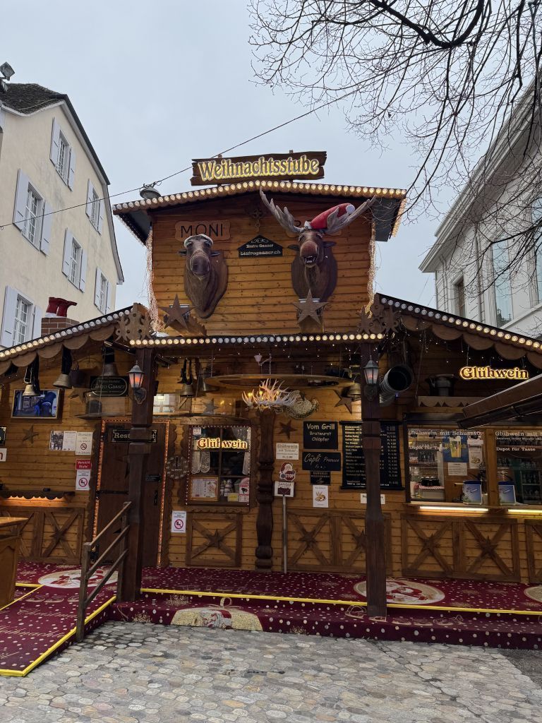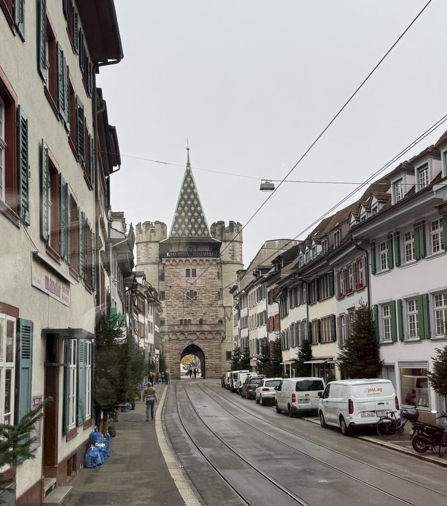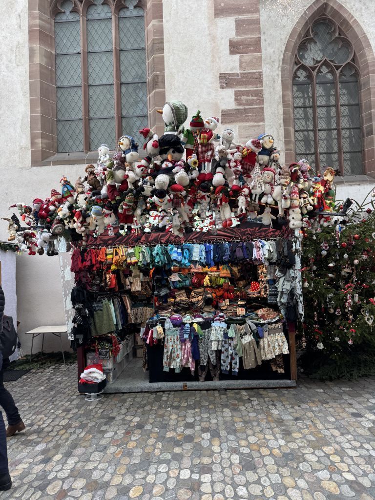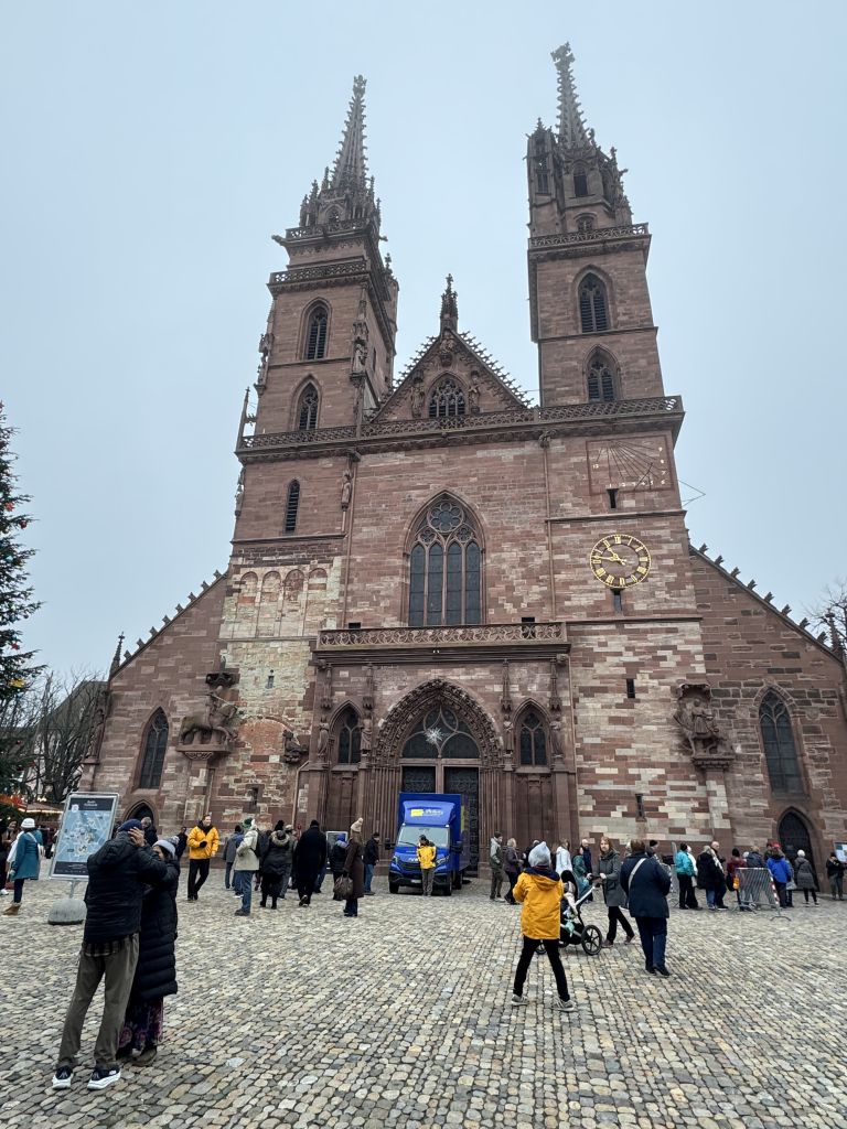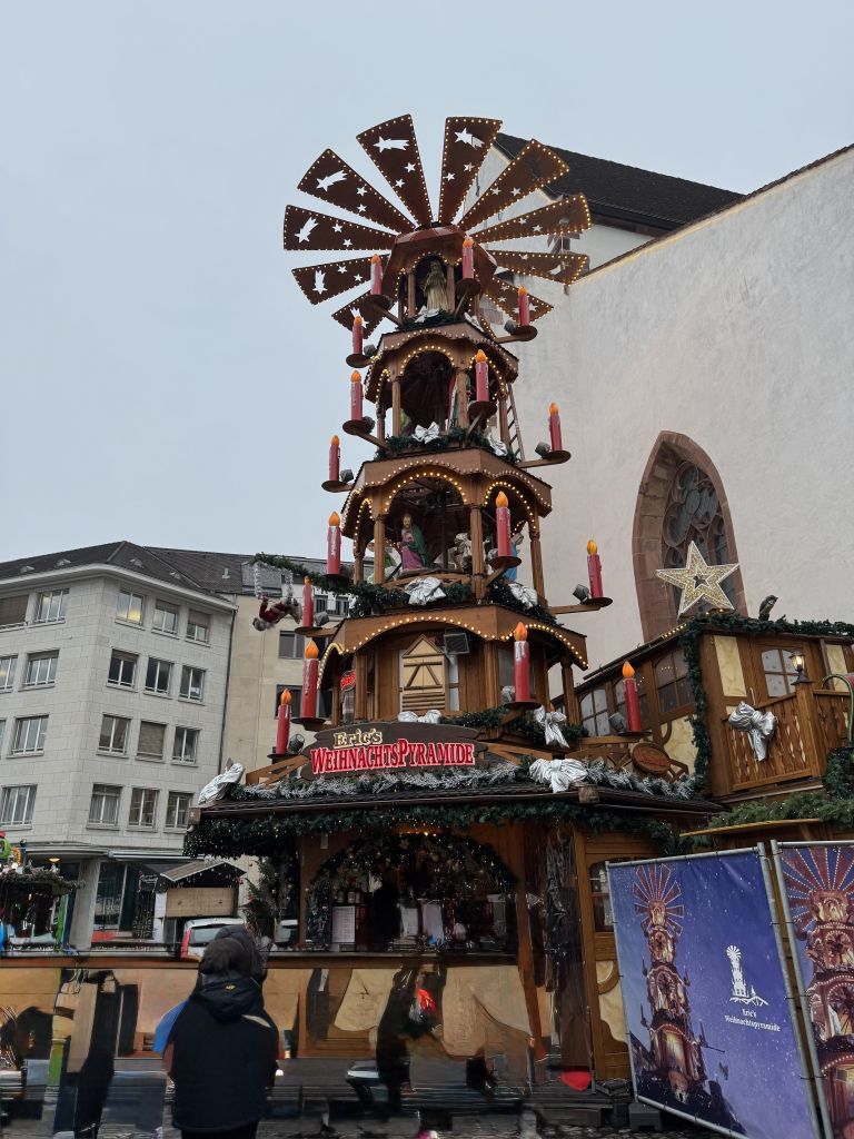 ‘It was an early morning. Our bags had to be in the hall before 7:00. Anything we needed after that had to be in a carry on. We had breakfast, made sure the room was empty of our things by 8:00, then went to the lounge for almost an hour. The crew has 4 hours to get ship ready for the next set of passengers.We boarded our busses according to color luggage tag we were given so we got on the green bus which actually had a green roof. We were driven through the town of Basel on our way to the cathedral. The guide was very proud the were the pharmaceutical capitol of the world. Now I can’t remember who is headquartered there, but there were several. Then we went to the main square where we met our guide. Since we’re in the leisure group, we walked at a slower pace than other groups, which was fine with me. We walked up a long hill to the cathedral, went into the cloister, then went to have a view of the Rhine. Then we worked our way back down to the plaza where the big Christmas Market was. We found a small restaurant and went inside. It was very small but they had a free table for us. Switzerland is a very expensive country. The Canadian dollar is almost half a Swiss Franc. Rudy was grousing at the cost so only ordered beer. Betty and Verna each ordered a Swiss pizza. I ordered a Raclette. Their pizzas came and were huge. The crust was very thin. My raclette was a layer of hash browns, a layer of ham, a layer of cheese with a fried egg on top. They were all about 34 Swiss Francs each-$40 US. Mine was delicious but big enough for 3 people. So I ate a third of it and passed it to Rudy. He couldn’t finish it either . I noticed in the hallway there were stacks and stacks of boxes labeled Gluwein. Seems they don’t brew their own. Now the just heat it up.. From lunch we went to the Christmas Market around an old monastery. It was nice but mostly the same as we’d seen before. Betty bought my mug since I bought hers yesterday. That was pretty much our only purchase. Verna bought a package of little cookies.