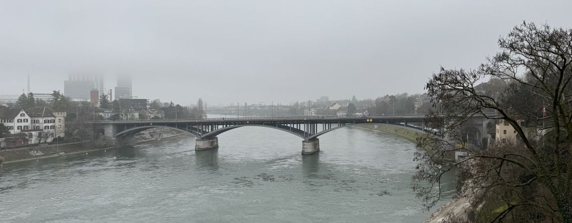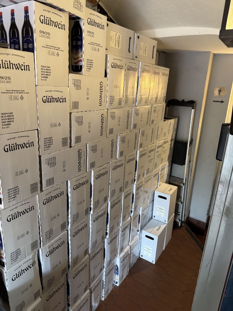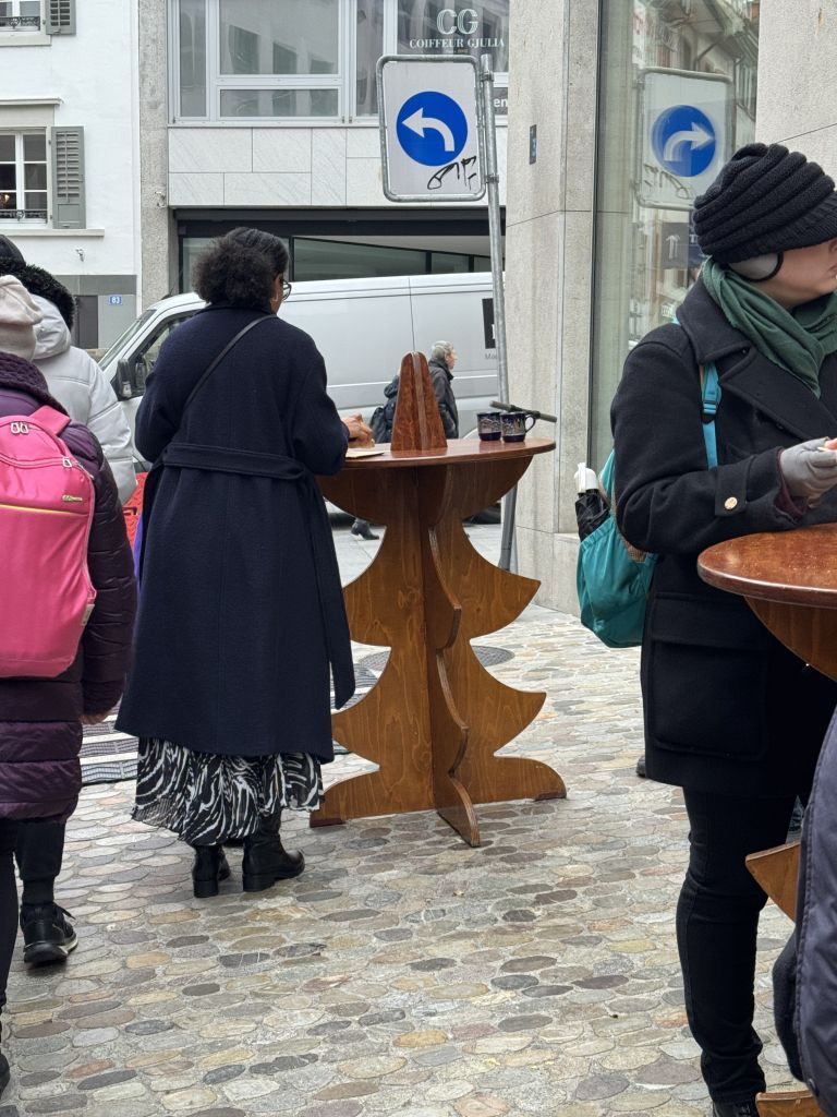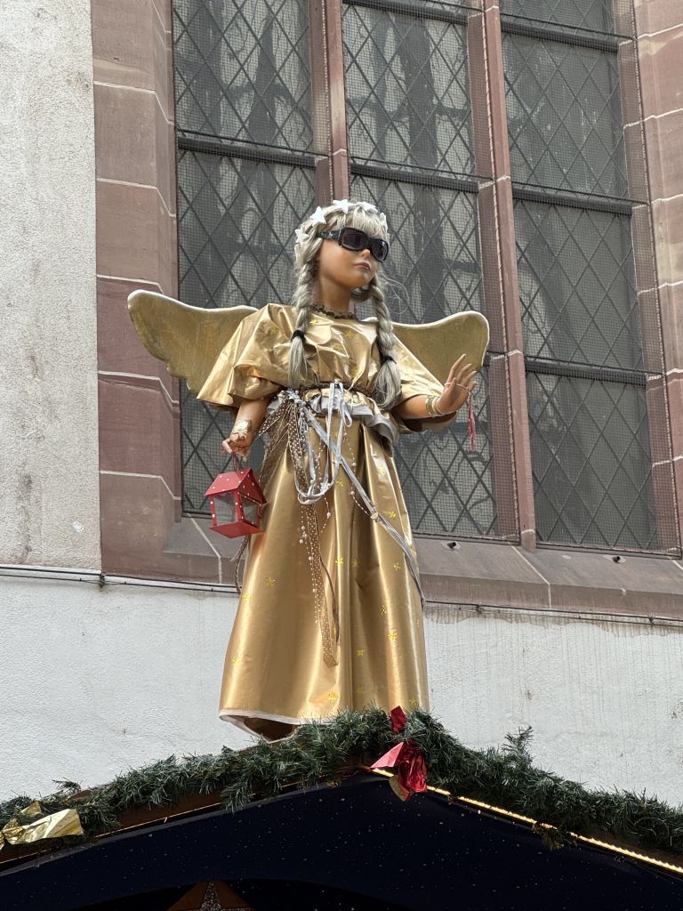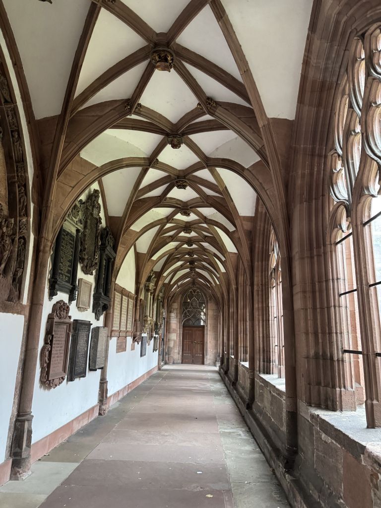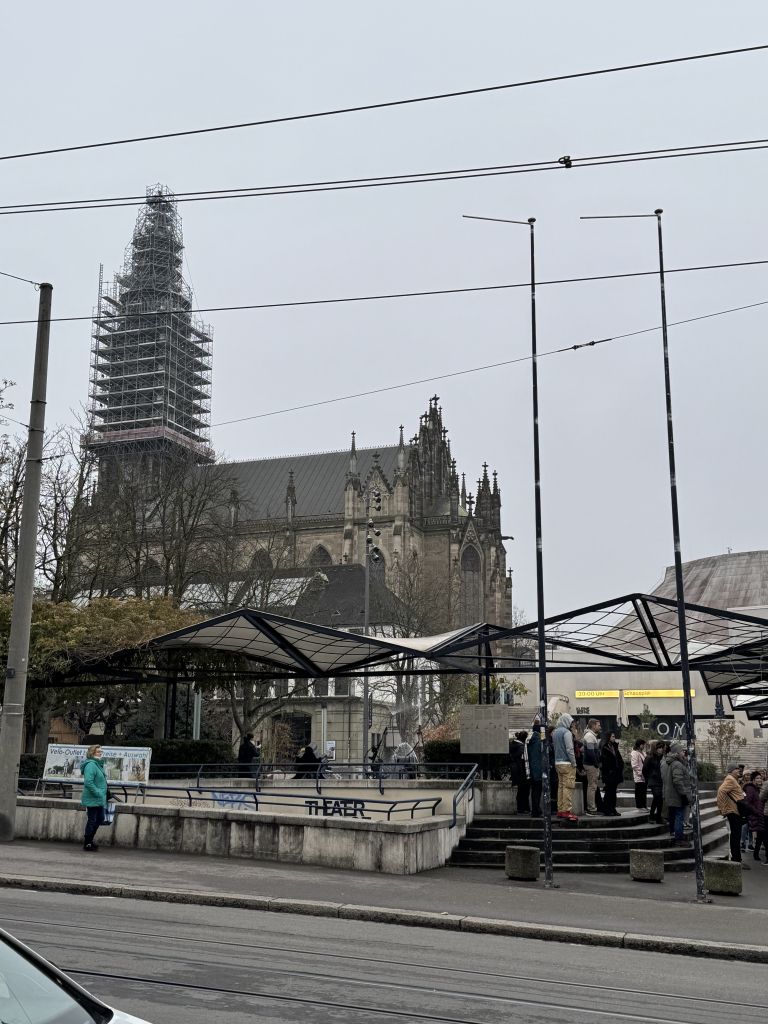 ‘It was an early morning. Our bags had to be in the hall before 7:00. Anything we needed after that had to be in a carry on. We had breakfast, made sure the room was empty of our things by 8:00, then went to the lounge for almost an hour. The crew has 4 hours to get ship ready for the next set of passengers.We boarded our busses according to color luggage tag we were given so we got on the green bus which actually had a green roof. We were driven through the town of Basel on our way to the cathedral. The guide was very proud the were the pharmaceutical capitol of the world. Now I can’t remember who is headquartered there, but there were several. Then we went to the main square where we met our guide. Since we’re in the leisure group, we walked at a slower pace than other groups, which was fine with me. We walked up a long hill to the cathedral, went into the cloister, then went to have a view of the Rhine. Then we worked our way back down to the plaza where the big Christmas Market was. We found a small restaurant and went inside. It was very small but they had a free table for us. Switzerland is a very expensive country. The Canadian dollar is almost half a Swiss Franc. Rudy was grousing at the cost so only ordered beer. Betty and Verna each ordered a Swiss pizza. I ordered a Raclette. Their pizzas came and were huge. The crust was very thin. My raclette was a layer of hash browns, a layer of ham, a layer of cheese with a fried egg on top. They were all about 34 Swiss Francs each-$40 US. Mine was delicious but big enough for 3 people. So I ate a third of it and passed it to Rudy. He couldn’t finish it either . I noticed in the hallway there were stacks and stacks of boxes labeled Gluwein. Seems they don’t brew their own. Now the just heat it up.. From lunch we went to the Christmas Market around an old monastery. It was nice but mostly the same as we’d seen before. Betty bought my mug since I bought hers yesterday. That was pretty much our only purchase. Verna bought a package of little cookies.