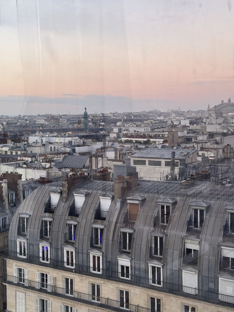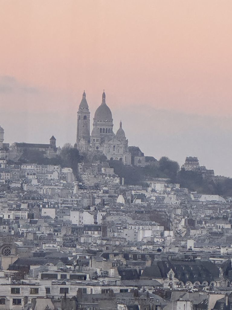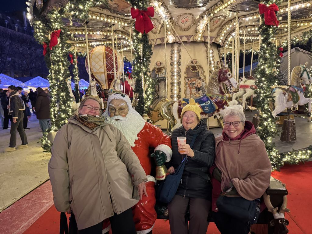 Today was a cloudy day but no rain, thankfully. The group plan was to go to the Montmartre area. I elected to stay behind and give my legs a rest from yesterday. I rested in the room and met the group outside the Louvre in the Tuileries gardens. We chose a place to meet that was pretty easy to spot. I took a taxi and he let me off exactly where I wanted to be. I walked toward the arch where we were supposed to meet and I saw Rudy waiting. He didn’t think it would work but I knew the area and it was a good meeting spot. It was around 4:30 and the area was filling up. There is a Christmas market in the gardens. We walked toward the market along with everyone else. There is a big Ferris wheel just as we entered the area. Rudy offered a ride for us all. I was the only taker so we went. Some of my photos today are from the ride. The market is a long, narrow section that runs along the side of the gardens. The Christmas markets I visited before were full of handcrafted items with a few food tents. This was more of a food and wine affair with kids games and rides along the way. Betty and Verna got hot wine in decorated plastic cups. I found a stand that had hot cider in the cups but my cup wasn’t as nice as theirs. The other markets I’ve been to gave ceramic mugs with the drinks. We felt a little cheated. Finally about 2/3 of the way along the market we found some booths with handcrafted items. Of course I checked out a jewelry booth.. He had a very nice turquoise pendant. I asked if he made all the jewelry and he did. He said the turquoise was from Arizona. I told him I was from California andI saw lots of turquoise. He did have some beautiful pieces but I resisted the urge to buy. We have many more markets to go in Germany.