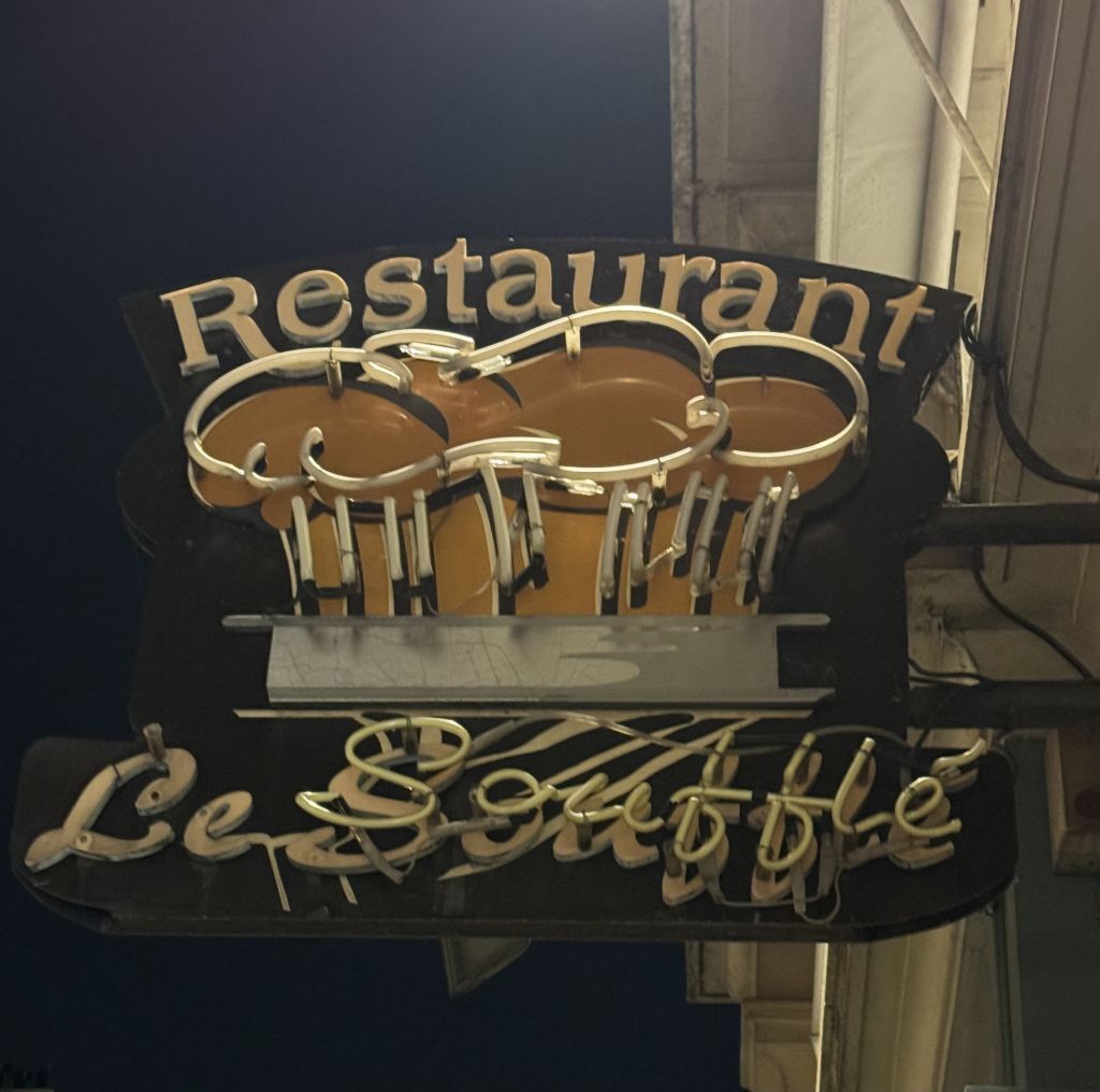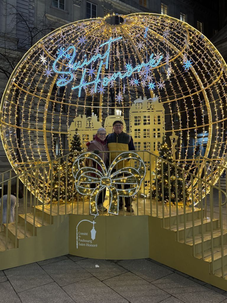 ‘From there we walked toward my favorite restaurant in Paris. I thought I remembered the way but I overshot the street by a couple of blocks. So we turned around and went back by a different route. We ended up on the Rue St Honore which is one of the priciest shopping streets in the city. We saw many stylishly dressed women with many shopping bags in their hands. Every store had a guard by the door. We decided they were there to decide if a person could afford the shop! We ended up in a small plaza in front of an old church that had a setting where you could have a photo taken. I took a picture of Rudy and Betty. A couple more blocks and we were at the restaurant-30 minutes early. Our reservation was for 7:00 and that’s when they open. So we strolled a bit but it was 40 degrees out and we were cold. We went across the street to a bar and the others had coffee. Then it was time to go to Le Souffle. As the name implies, they are known for their soufflés. I have been going there since the 80’s and the food is perfect every time. I ordered a ham and cheese soufflé, with a chocolate one for dessert. They didn’t disappoint. Everyone enjoyed their meal and wine. It was a pleasant dinner. We took an Uber back to the hotel.