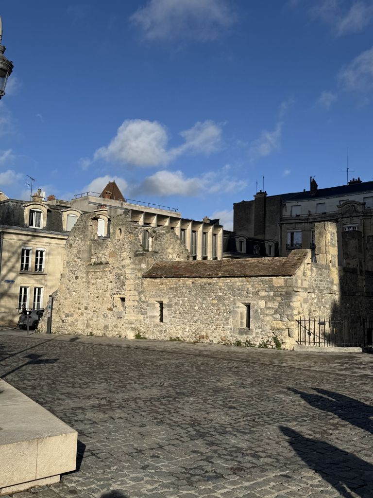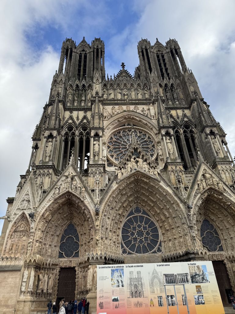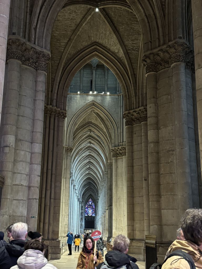 We had the ships tour director as our guide on the way to the ship. Emma is “une dame d’un certain age”-indeterminate somewhere between 40 and 60. We left amid a pouring rain and ran into two accidents on the way out of town. We made it to Reims and had a tour of the Cathedral. It’s huge-bigger than Notre Dame. Of course it hasn’t been refurbished and it was pretty dark inside. But the weather cooperated and it cleared up while we were there so the sun was shining in the windows. There are two rose windows, one above the other in the front of the building. In the back are smaller windows done by the artist Marc Chagal. They’re very pretty. This cathedral was where all the French kings were crowned so it’s a pretty important place. Joan of Arc was also here.